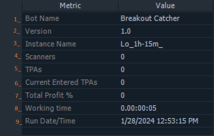 9_Run Date/Time: Displays the date and time when the Breakout Catcher Bot was last initiated or its current operational session began.