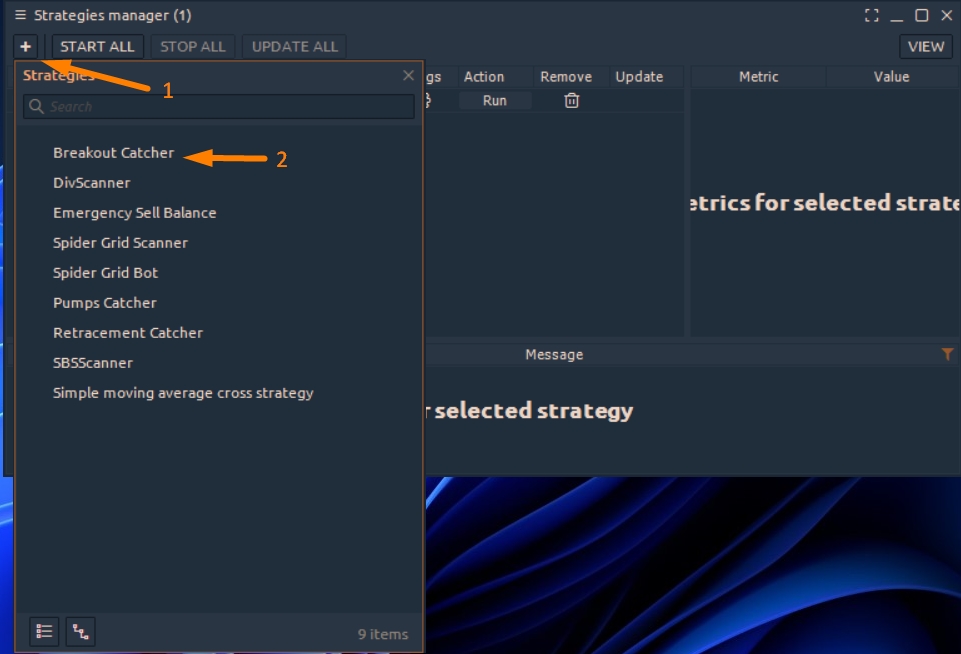 4_From Strategies, Choose "Breakout Catcher": In the list of available strategies, locate and click on "Breakout Catcher." This selection adds the Breakout Catcher Bot to your trading setup, enabling you to access and customize its settings.