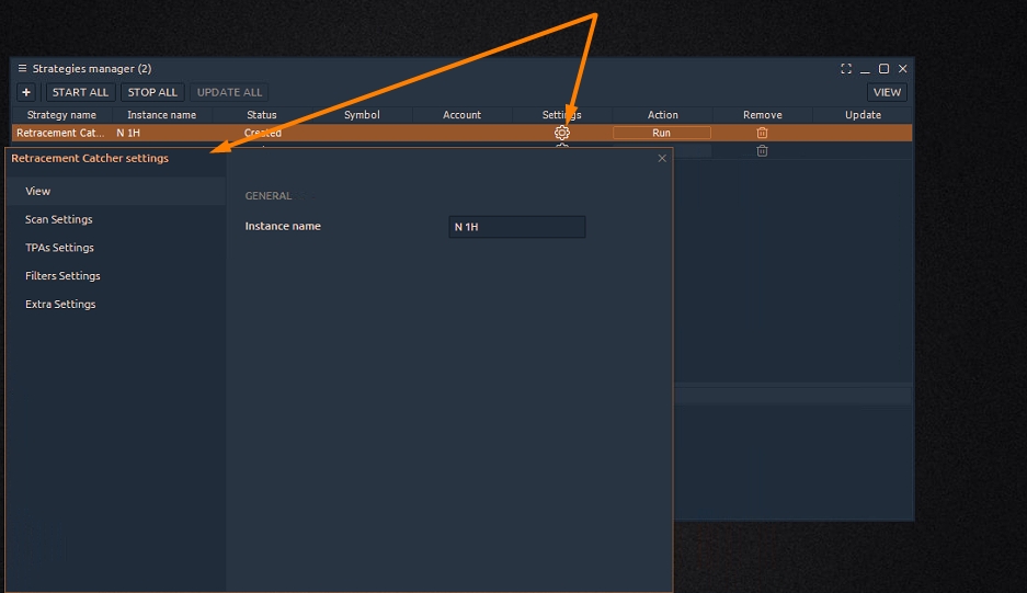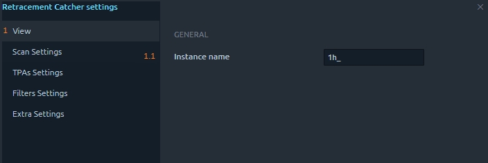This section allows users to assign a unique name to their current instance of the Retracement Catcher Bot. The instance name is a user-defined label that helps differentiate various bot configurations, especially for users managing multiple instances simultaneously and will be the first part of the creator name in the TPAs added by this instance of the bot.