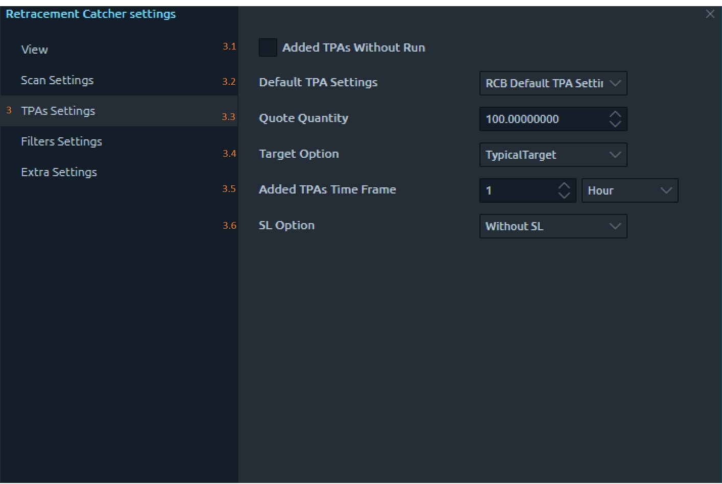 Users can choose from predefined TPA settings or select from five additional custom settings (Setting0, Setting1, Setting2, Setting3, Setting4) to tailor TPAs to their trading preferences.