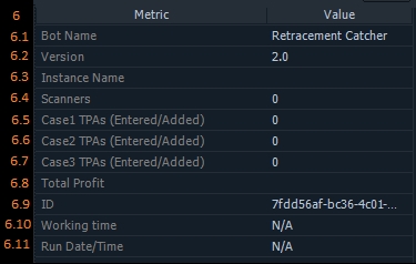 Displays the unique identification number assigned to the Retracement Catcher Bot. This ID helps in tracking and managing multiple instances of the bot.