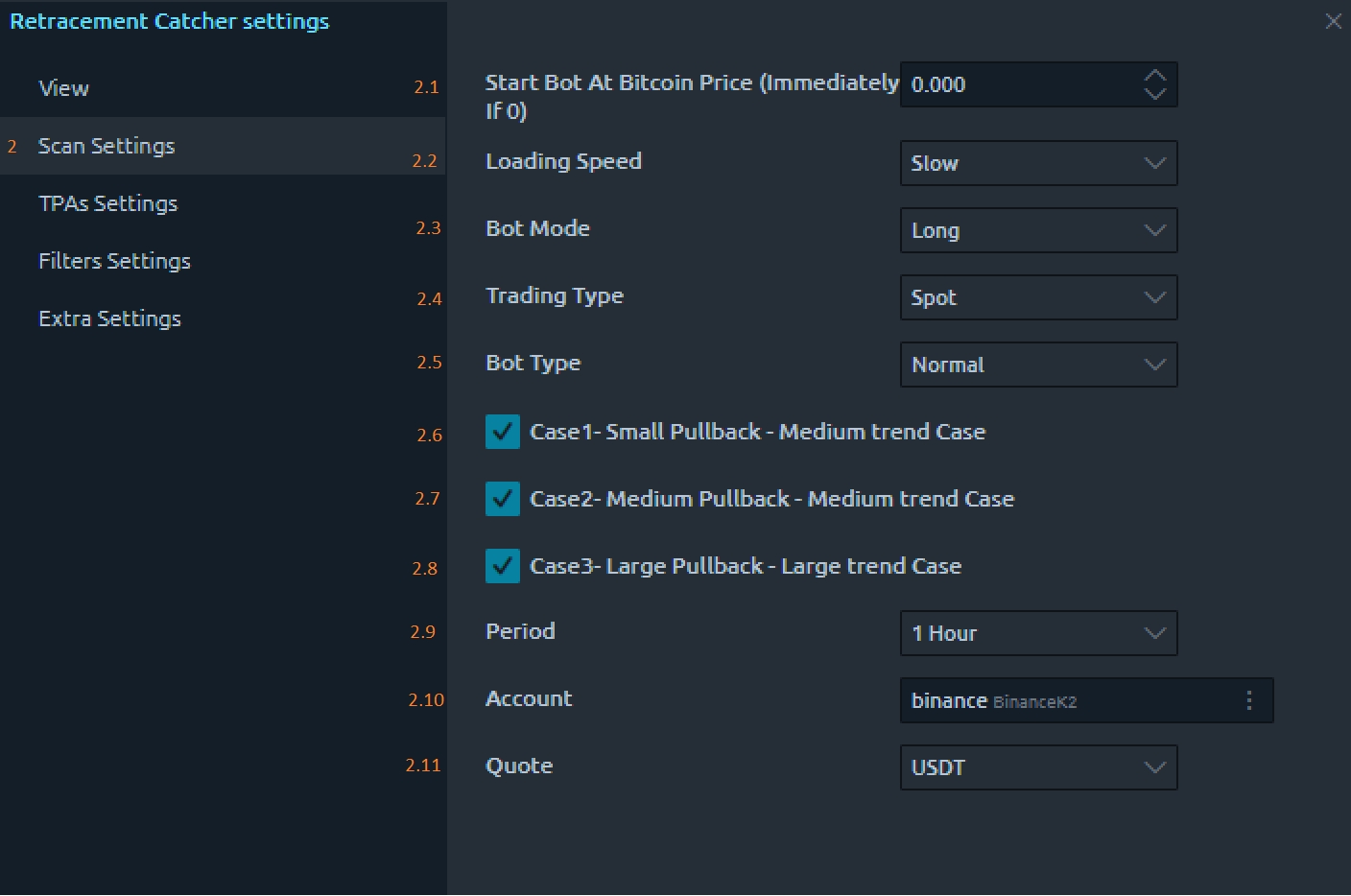 Users can choose from three checkboxes (Case1, Case2, Case3) to further confirm trade entry based on the size of the retracement trend. These checkboxes work in tandem with the selected Bot Type.