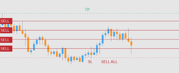 In the Bearish Mode, when the price hits TP, the bot will just stop. When the price hits SL the bot will stop and buy all buy limit orders at the SL price.