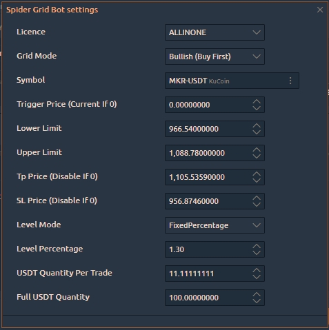 Spider Grid Bot will then keep buying and selling this pair at each level in the specified range until the price hits TP or SL then it will stop.