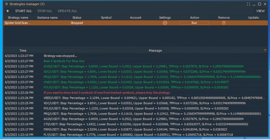The Spider Grid Scanner is a complementary strategy to the Spider Grid Bot. It scans the whole trading pairs (ex. USDT pairs) on a certain exchange like Binance, Kucoin, Huobi, OKx, or FTX, to give the best 5 pairs to run the Spider Grid Bot on.