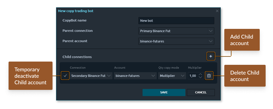 The "Copy trading" panel allows you to duplicate all your trading activities among multiple accounts (Parent & Child) within one exchange or broker.