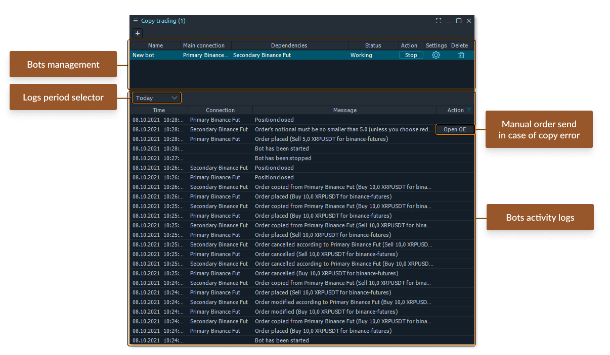 All actions of activated Bots will be shown in a Logs list at the panel’s bottom, including information about "start" & "stop" time, and all of the copy-trading activities. You can even change the logs period on the toolbar above the Logs table.