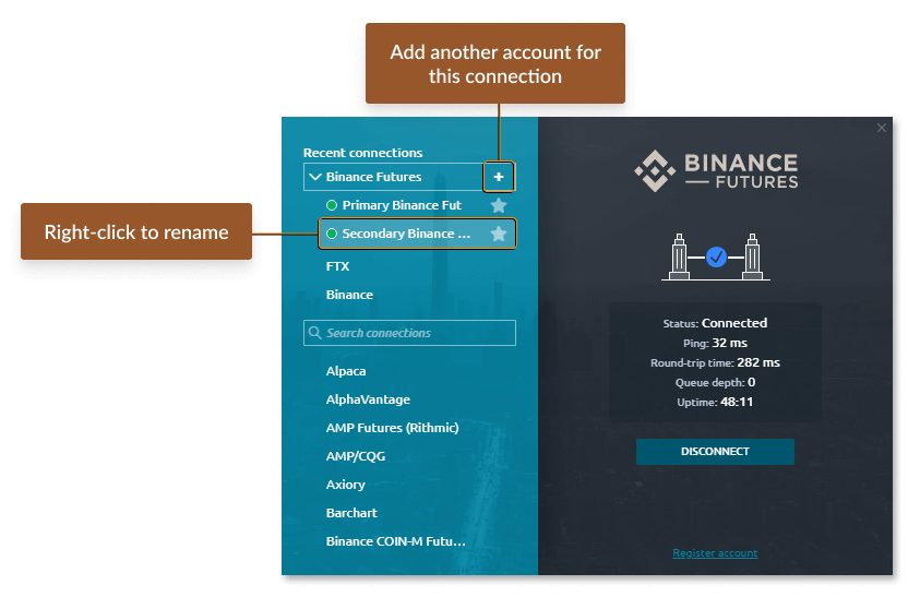 The Copy trading panel currently supports the following connections only: Binance, Binance Futures, Bitfinex, Bybit, BitMEX, and Interactive Brokers