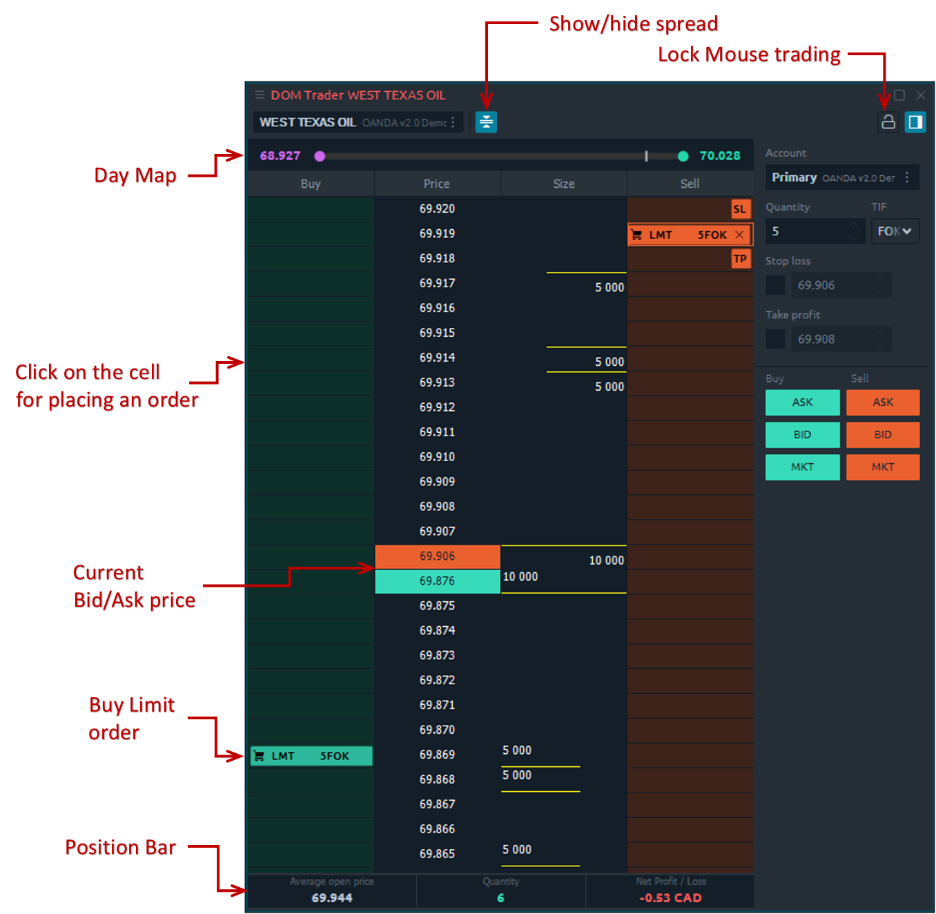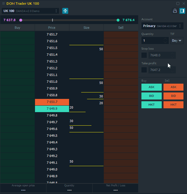 DOM Trader allows to send trading orders in two ways β Mouse Trading mode and Order Entry