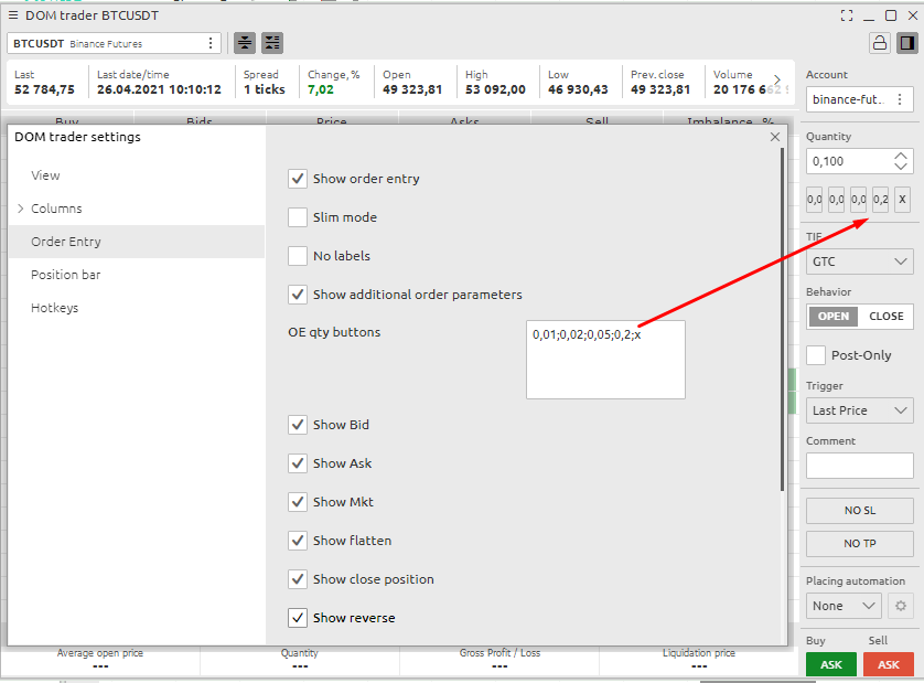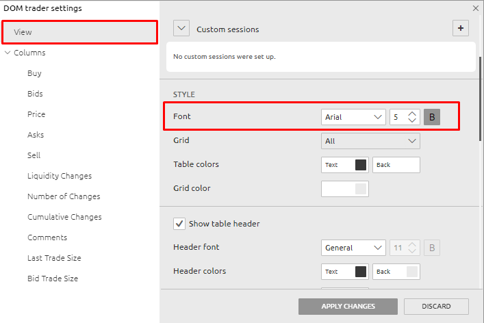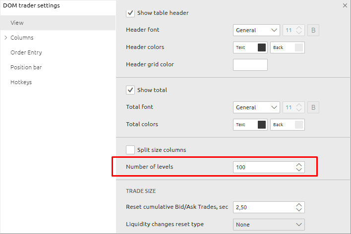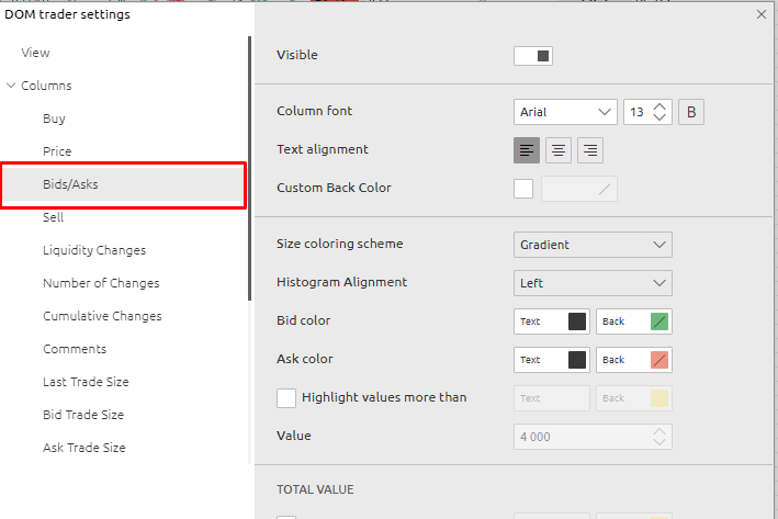 Note that after applying this setting, you must close the PANEL with settings and reopen it. You will see a new BID/ASK column - this will be the general settings for this column. You may have to edit these again to improve the readability of the DOM TRader