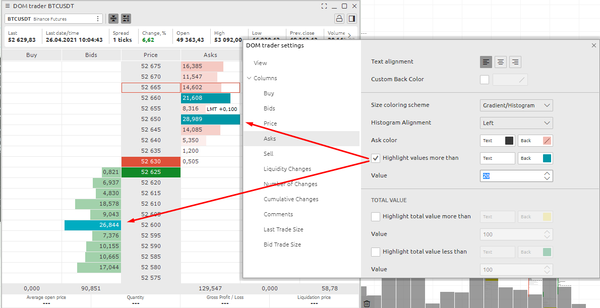 How to highlight large volumes in Dom trader