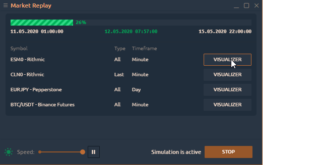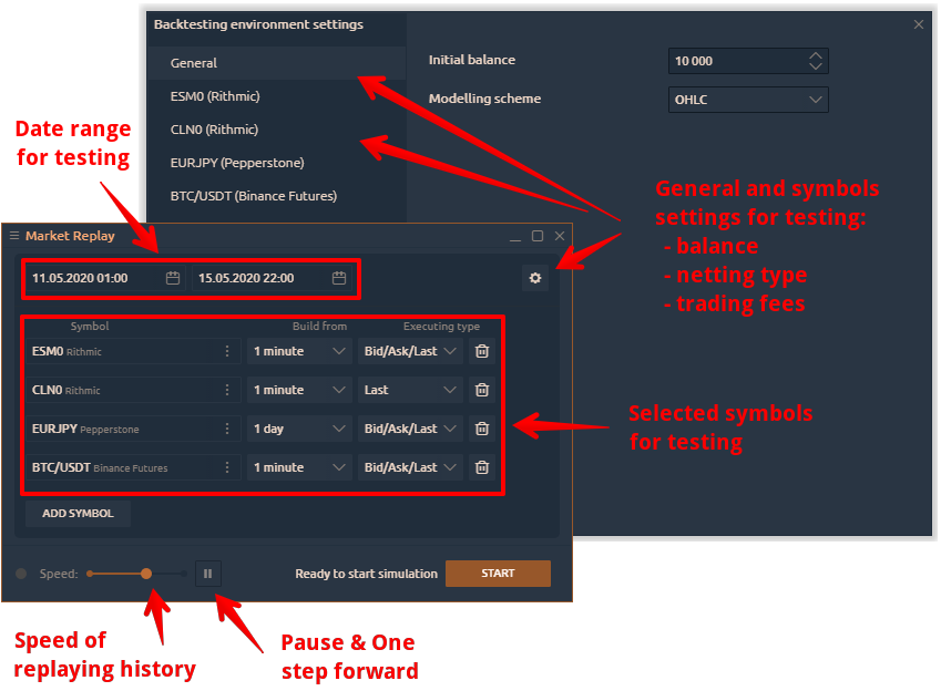 Market Replay (or History Player) allows you to test strategies on any trading instruments with any data provider or broker