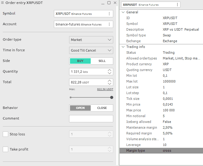 This window contains summary information about your order, which will allow you to verify the correctness of the entered data - order type, trade instrument, price, quantity, prices of take profit and stop loss.