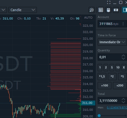 Below we will look at how to create an order on the Bybit exchange from the quick order entry panel from the chart. Before we do this, make sure that you have successfully connected to the Bybit exchange, and selected a trading pair from this connection.