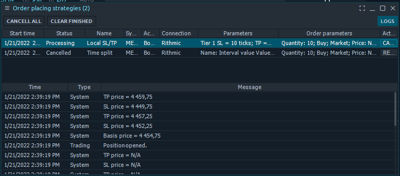 You can find all of the active and finished Placing strategies in the corresponding panel, which you may launch from the 3rd Dimension start menu. This panel contains the list of created Strategies and a logs section. You can click on any Strategy and see how it works and what actions it performs. Here you can also stop any active strategy or clear the finished ones.