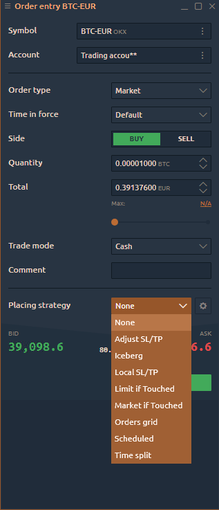Here comes the functionality of Order placing strategies, allowing simple automation of complex order submission. You can find the corresponding control in every Order entry panel or sidebar.
